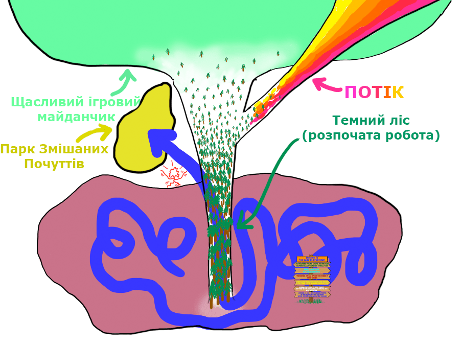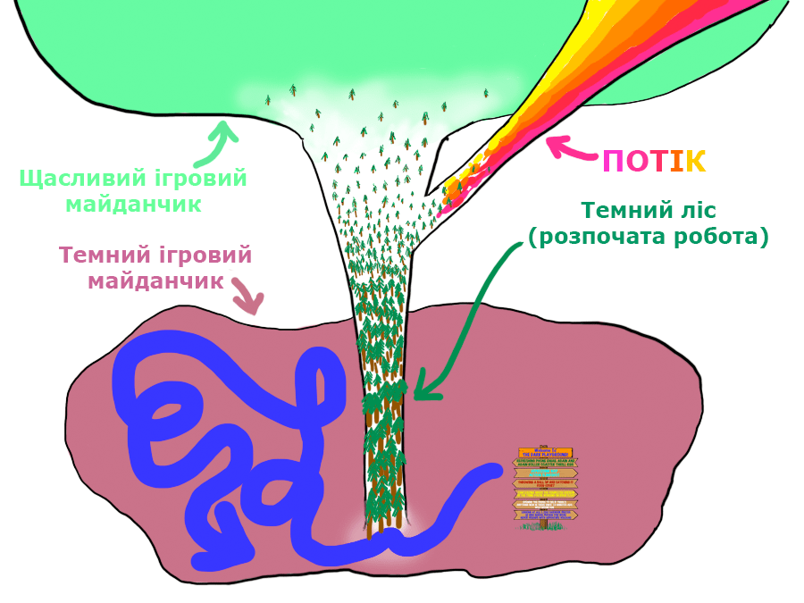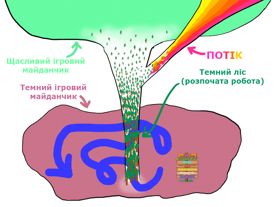 Критичний Вхід - та відправна точка, з якої ви починаєте працювати над завданням. Темний Ліс - процес виконання роботи. Як тільки ви закінчите, ви опинитесь на Щасливому Ігровому Майданчику - місці, де ви відчуваєте задоволення і де відпочинок приємний і приносить радість, тому що ви виконали щось складне. Іноді можна так захопитися тим, над чим працюєш, що опиняєшся в Потоці, де втрачається відлік часу.